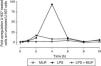 Time-course expression of IL-1β in U-937 cells. Triplicate cultures of 4×106 U-937 cells in the presence of MLIF, LPS or both were harvested at 0.3, 1, 2, 4, 6, 8 and 10h. RNA was obtained from pellets and used for real time PCR. Comparative expression was established using unstimulated cells as reference. LPS induced a strong up-regulation of IL-1β which peaks at 4h. MLIF per se did not affect IL-1β basal expression but MLIF was able to reduce significantly the stimulatory effect of LPS when amebic peptide was added simultaneously to LPS (p=0.05). Bars of SEM are <1 in all points.