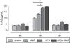 Time-course of IL-1β immunoreactivity in U-937 cells. Triplicate cultures of 4×106 U-937 cells in the presence of MLIF, LPS or both were harvested at 4, 6 and 8h by centrifugation. Supernatant fluids were employed for IL-1β immunoreactivity. In general IL-1β released to medium was low at 4 and 8h, response to LPS was higher at 6h *(p=0.05), MLIF per se had no effect over IL-1β release and did not interfere with LPS stimulation.