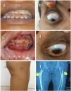 A 28-year-old female was referred for bilateral thigh pain for the past six months. She had history of five first trimester abortions of non-consanguineous marriage, Abortus 5. Of the five, two were induced for skeletal anomalies – campomelic dysplasias. On examination, she was short statured (<3rd centile), with abnormal dentition (Fig. 1a), skeletal anomalies – dolichocephaly, pectus carinatum, genu recurvatum, and bilateral pes planus. The cornea was surrounded by a blue sclera (Fig. 1b). There was no muscle tenderness or arthritis. X-ray thigh antero-posterior view showed inward bowing and sclerosis of middle one-third of both femur. Computed tomography of thigh showed (Fig. 1f) diffuse sclerotic changes involving lateral aspects of metaphysis and diaphysis in bilateral femur. Metabolic bone profiling, including, serum calcium, phosphorus, alkaline phosphatase, vitamin D, and parathormone was normal. Based on the clinical clues, possibility of collagen disorder was considered and suggested genetic testing. The genetic analysis showed a heterozygous mutation at exon 5 of COL1A1 gene c.1678 G>A with autosomal dominant pattern of inheritance of osteogenesis imperfecta. Dual energy X-ray absorptiometry revealed a T score of −2.7 at hip and −3.3 at spine. On screening her family members, dentinogenesis imperfecta (Fig. 1c), blue sclera (Fig. 1d), and osteoporosis were seen in her mother with a healthy sibling. The index case has presented with a deforming OI with blue sclera, no pathological fractures and currently remains unclassifiable as per Sillence classification 2012. Differential diagnosis includes Ehlers-Danlos, Loeys-Dietz and joint hypermobility syndrome. Common clinical features shared include joint laxity, osteopenia and blue sclera. However, they differ in the genetic defect causing them.1 She was treated with NSAIDS, braces to offload, targeted muscle strengthening, and joint stretching exercises. Geneticist consultation has been obtained and patient is being followed up. Pain VAS scale has reduced from 8 to 4.