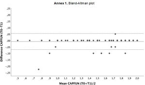 Ninety-three (81.6%) participants were considered in this analysis, all were considered stable (GROC: 1). The median number of days between T0 and T1 was 15 (IQR, 13–19). The ICC (2.1) for the CAPFUN was 0.999 (95% CI: 0.998–0.999), a value that was considered acceptable. Table 2 lists the ICC (2.1) for the total score and for each domain of the CAPFUN together with the SEM and MDC.