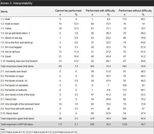 Tools to measure functional capacityThe CAPFUN scale comprises 20 items, divided into 8 upper-limb, 8 lower-limb, 3 combined, and 1 cervical spine activity. Each item is assessed on a scale of 0–2: 0 for impossibility to perform, 1 for incomplete or difficult performance, and 2 for correct performance. The total score ranges from 0 to 2, derived from the average score across all evaluated activities.11