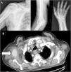 Con sospecha de afectación de plexo braquial se solicita resonancia magnética (RM) cervical, que resulta normal y electromiografía, que evidencia axonotmesis parcial del nervio radial. También se realiza TC torácica que objetiva una masa ovalada en axila derecha de bordes irregulares y densidad similar a la arteria axilar, por lo que se completa estudio con angio-TC (fig. 1 b) que corrobora que dicha imagen tiene continuidad con esta, diagnosticándose de seudoaneurisma de arteria axilar derecha, hematoma axilar y axonotmesis del nervio radial ipsilateral secundarios a traumatismo cerrado. Se deriva al paciente a cirugía vascular que realiza ecografía-Doppler, drenaje del hematoma y exclusión del seudoaneurisma mediante endoprótesis. Actualmente se encuentra en tratamiento rehabilitador con objetivo de recuperar la fuerza perdida por la lesión y en seguimiento periódico en consultas externas de reumatología y cirugía vascular.