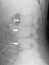 In imaging studies, in addition to marked bone sclerosis, her spine showed the presence of lines parallel to the cortex of the vertebral bodies giving rise to an image of a small copy of the vertebral body within the body, a sign called “bone within a bone” (Figs. 1–3). This sign was evident in several vertebral bodies. Morphometric vertebral deformities showed no calcification of paraspinal ligaments.