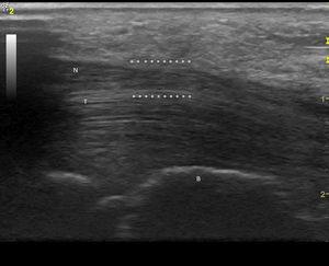 Corte transversal del nervio mediano derecho a nivel de la entrada del túnel del carpo, con medición del área del nervio con elipse (0,17cm2), a nivel del pisiforme P (B: hueso grande). (Imagen obtenida con ecógrafo General Electrics LOGIC e, con un transductor linear de 8-12 mHz usando para esta imagen una frecuencia de 12 mHz y un agrandamiento máximo).
