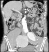 The patient was an 86-year-old man who was taking 2 medications for hypertension. He had a history of several months of low back pain that radiated to right thigh, for which symptomatic treatment provided partial relief. His rheumatologist had ordered thoracolumbar magnetic resonance imaging (MRI), but it was not performed because, prior to the scheduled date, the patient went to the emergency department with an increase in the intensity of the pain. Laboratory analyses showed a hemoglobin level of 8.4g/dL, lactate dehydrogenase of 318U/L, creatinine of 1.29mg/dL, C-reactive protein of 6.16mg/dL, erythrocyte sediment rate of 24mm/h and mild hypoproteinemia. There was no evidence of hemodynamic instability. He underwent abdominopelvic computed tomography (CT) with intravenous contrast, which revealed isolated bilateral iliac aneurysms>6cm (Fig. 1) with contained rupture of the aneurysm on the right (Fig. 2), which displaced the psoas muscle (Fig. 3) and perforated the ipsilateral iliac bone (Fig. 4). The patient underwent aortobifemoral bypass but, unfortunately, he died during the postoperative period.