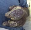 Caso clínicoVarón de 46 años de edad con antecedentes de hiperuricemia, amputación traumática del 4.° y 5.° dedos de la mano izquierda y gota tofácea crónica durante 8 meses automedicado con glucocorticoides. Fue ingresado con historia de 12 días de presentar aumento de volumen en segundo dedo mano izquierda, agregándose dolor, hiperemia y salida de material de aspecto purulento. A la exploración física se encontraron tofos en ambos codos, manos y pies en superficies extensoras y flexoras, el más grande abarcaba la totalidad del segundo dedo izquierdo (fig. 1). Al ingreso, los niveles de ácido úrico y cortisol fueron de 10,4mg/dl y 10,39mg/dl, respectivamente; la eTFG fue de 11,96ml/min3. El material exudativo encontrado en los tofos, mediante aspiración por aguja, fue analizado en microscopía con luz polarizada, revelando abundantes cristales de urato monosódico y escasos leucocitos (fig. 2). Los cultivos del aspirado se reportaron negativos para crecimiento bacteriano. En las radiografías de mano se observaron erosiones óseas típicas de gota (fig. 3).