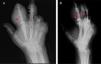 A) Radiografía dorsopalmar de mano izquierda. B) Radiografía lateral de mano izquierda. En ambas se aprecia aumento de volumen en tejidos blandos en segundo y tercer dedo correspondientes con tofo (*), en los tejidos óseos resalta la presencia de erosiones en borde colgante (flechas), con pérdida de espacio articular.