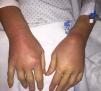 On physical examination, fair general condition, afebrile, blood pressure 130/76mmHg, heart rate 107 beats per minute. Important inflammatory signs (oedema, erythema, heat and functional limitation) of both carpi (Fig. 1), second metatarsophalangeal joint and left sternoclavicular joint were observed. No rash, adenopathies, oral and/or genital ulcers, or skin lesions. The rest of the examination was normal.