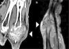 An 80 year-old male patient with a history of controlled high blood pressure, presented with a lesion in the dorsal region at the base of his third finger of the right hand, of several months duration. Physical examination of the lesion revealed that it was of solid consistency and partially deep layer attached. It was therefore diagnosed as a soft tissue tumor. An ultrasound scan was requested which detected a soft tissue mass with diffuse echotexture (Fig. 1A). In view of these findings, CT and MR scans were performed. From these tests we observed that the tumor had a lobulated morphology, contained calcifications and eroded the adjacent bony surfaces (Figs. 1B and 2). The tumor enhanced heterogeneously following the administration of intravenous line contrast dye. As a result of these findings, we decided to perform a biopsy in which uric acid crystals were detected, confirming the diagnosis of arthropathy by crystal deposits (Fig. 3).