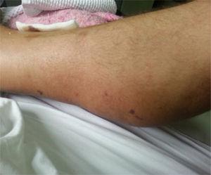 Observación clínicaVarón de 47 años que consulta por pérdida de peso (10kg) y dolor incapacitante espontáneo en pantorrillas de un mes de evolución. Examen físico: fiebre (38,5°C) a predominio vespertino, taquicardia, presión arterial 160/100mmHg, tumoraciones eritematosas en músculos gemelos (6×10cm aproximadamente), de consistencia duro-elástica, calientes y sensibilidad termoalgésica conservada (fig. 1). Además se observaron máculas eritemato-purpúricas en cara anterior y posterior de piernas, dolor testicular a la palpación y artritis en carpos, articulaciones metacarpofalángicas e interfalángicas proximales.