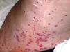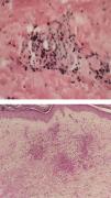 A y B). La biopsia de la piel afectada mostrada en la imagen anterior presenta en el panel superior, infiltrado en la dermis papilar, con extensión a la dermis reticular (40×) y un acercamiento, en el panel inferior, del infiltrado que ocupa toda la pared del vaso sanguíneo, con leucocitoclasia (100×, HE).