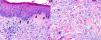 A) Epidermis con degeneración vacuolar de la basal (asterisco), queratinocitos necróticos aislados (flecha) e infiltrado linfocitario discreto asociado. Se observa verticalización de las células de la capa basal (cabeza de flecha), rasgo histológico asociado con frecuencia a eritema multiforme. Infiltrados linfoplasmocitarios y melanófagos en dermis papilar. B) Dermis reticular con infiltración intersticial de mucina ácida (asterisco).