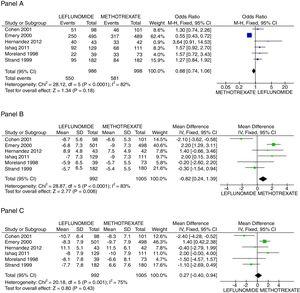 Treatment group comparisons were made between leflunomide and methotrexate. For measurements of treatment effects, and other analysis we used RevMan Analyses V5 software. Discrete data were analyzed calculating the odds ratios and their 95% confidence intervals. Continuous data were analyzed comparing their mean differences with their 95% confidence intervals between intervention groups. Forest graphics and p values were obtained with fixed effect analysis, heterogeneity effect among clinical trials were measured with X2 and I2 statistics. Main outcomes are reported accordingly they were reported in the original studies, either per-protocol o for intention-to-treat analysis.