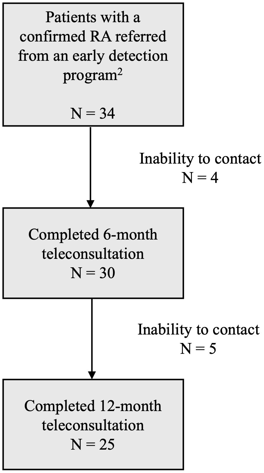 Material and methodsWe conducted a prospective, observational study in patients with recent-onset RA recruited from an early arthritis detection program between May and November 2023. Following baseline in-person evaluation, patients were enrolled in a telemonitoring protocol consisting of two scheduled video consultations at 6 and 12 months. Clinical outcomes were assessed at each visit using the Health Assessment Questionnaire (HAQ), the Clinical Disease Activity Index (CDAI), and patient-reported joint counts.
