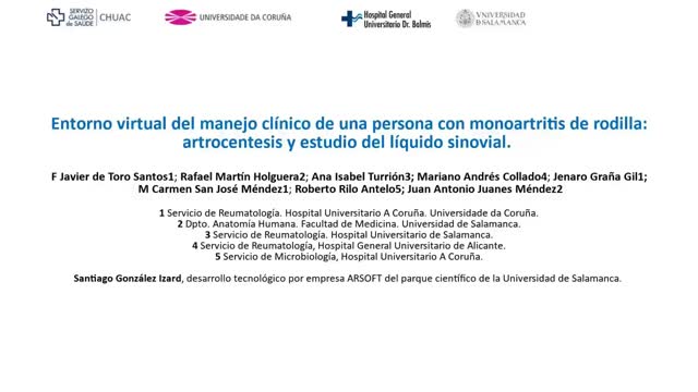 Con nuestro desarrollo tecnológico nos hemos planteado que el participante aprenda a manejar y experimentar el abordaje clínico de una persona con monoartritis, adquirir la competencia para realizar de forma correcta una artrocentesis de rodilla incidiendo en realizar una correcta asepsia y en la importancia de registrar en la historia clínica el consentimiento informado del paciente. Para ello, se repasan las bases anatómicas de la articulación de la rodilla con enfoque clínico, para que nos sirva de apoyo para la posterior artrocentesis e infiltración. Además, diseñamos varios escenarios clínicos para diferenciar los distintos tipos de líquidos sinoviales que podemos encontrar en una articulación y proporcionar una orientación clínica, a utilizar de forma adecuada los tubos de almacenamiento y transporte del líquido sinovial para su correcto procesado, a identificar los cristales más frecuentes que producen artritis por sus características cristalográficas y a manejar clínicamente la sospecha de una artritis infecciosa.