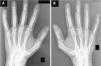 Presentamos el caso de un varón de 34 años diagnosticado de AIJ poliarticular FR positivo a los 15 meses de edad, basándose en poliartritis simétrica que afectaba a codos, carpos, articulaciones metacarpofalángicas e interfalángicas proximales de manos, rodillas, tobillos y articulaciones metatarsofalángicas, así como nódulos subcutáneos, positividad para el FR (353UI/ml) y reactantes de fase aguda elevados (velocidad de sedimentación 45mm/h, proteína C reactiva 6,5mg/l). No tenía otros antecedentes personales ni familiares relevantes. Fue tratado con antiinflamatorios no esteroideos, corticoides sistémicos e intraarticulares, sales de oro y metotrexato pero, a pesar de esto, la enfermedad permaneció activa con sinovitis persistente en ambos carpos, desarrollando subluxación bilateral a dicho nivel y limitación para la dorsiflexión y la pronosupinación. Las radiografías de ambos carpos mostraban acortamiento de la zona medial del radio distal, exageración de la inclinación radial y migración proximal de los huesos de la primera fila del carpo adoptando una forma en V entre en radio y el cúbito, compatibles con deformidad de Madelung (fig. 1). El paciente también desarrolló «dedos en resorte» en ambas manos y hallux valgus bilateral. A los 24 años se inició tratamiento con etanercept, lográndose el control de la actividad de la enfermedad desde entonces. Actualmente no presenta sinovitis en carpos, pero persiste la limitación de la movilidad, aunque no le impide desarrollar sus actividades habituales.