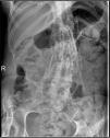 Radiograph of abdomen showing paravertebral bone bridges that are also seen in right hip.