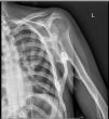 Radiograph of shoulder showing a well-defined plaque of mature bone between the chest wall, humerus and scapula.