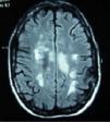 Cranial MRI in T2 and FLAIR sequences, with presence of multiple lesions in the white matter at the subcortical, periventricular, periauricular and right corona radiata levels. The largest lesion extends from the posterior limb of the right internal capsule to the right mesencephalic peduncle.
