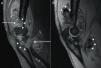 PVNS is a rare neoplastic-like pathological entity of unknown etiology affecting the synovium of the joint, tendon or bursa.2 It is usually a monoarticular process carrying with pain, swelling – often mild and intermittent – and progressive decreased range of motion. It affects in decreasing order of frequency the knee, hip, ankle, and shoulder, while elbows are rarely involved.3 MRI findings are highly suggestive of the diagnosis, as the characteristic low signal intensity on T2*-weighted sequences relates to the hemosiderin-laden macrophagic infiltrate seen on histological specimens,4 which is an important aid to the clinician to make differential diagnosis with other entities showing identical clinical picture, such as synovial or fibrous tumors, amyloid deposits and proliferative processes. Nonetheless, similar MRI features could be found in other hemorrhagic and chronic hyperplastic synovial disorders (as in rheumatoid arthritis, arthropathy secondary to hemorrhagic diathesis, chronic articular traumatism, haemangioma, synovial sarcoma), making the histological confirmation unavoidable.5