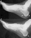 El estudio radiológico de manos, pies, tobillos y rodillas solo mostraba aumento de partes blandas en las localizaciones correspondientes a artritis, sin erosiones ni pinzamientos articulares, pero se identificaron entesofitos aquíleos bilaterales y espolón calcáneo derecho (fig. 2). La radiografía y la resonancia magnética de sacroiliacas fueron normales. En la ultrasonografía-Doppler se detectaron signos de sinovitis en segunda IFP y tenosinovitis de tendón flexor del tercer dedo de la mano izquierda, metatarsofalángica segunda y tercera derechas y segunda izquierda, articulación tibioastragalina izquierda y rodilla derecha, sin aumento de señal power-Doppler.