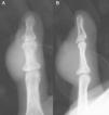 The case was a male patient, 65 years old, with no relevant medical history, who was consulted due to painless swelling on the dorsal side of the fifth finger of the left hand which had lasted for 4 years, with no history of trauma. Physical examination confirmed the tumor, elastic on palpation, with preserved finger mobility (Fig. 1) Simple X-rays showed a soft tissue tumor (Fig. 2); the ultrasound demonstrated the same lesion and the MRI showed a lesion measuring 16×10×12mm in diameter craneo-caudally, anteroposterior and transversely, unhomogeneous, with a hypointense signal and loculations on T1, predominantly hyperintense on T2 and showing moderate contrast enhancement (Fig. 3).