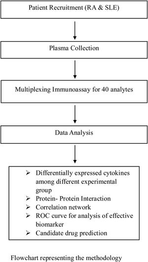 Material and methodologyStudy design and sample collectionThe study was designed based on the case–control and cross disorder study where cytokine levels among various groups: SLE and RA patients with healthy controls; SLE and RA patients were compared. Arthritis comorbidities among lupus patients were also compared with cytokine profile of RA patients. Further, the observed differences among the cytokine profiles were utilised for the prediction of potential biomarkers as well as novel drug(s).