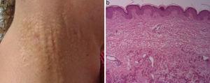 Mujer de 46 años, fumadora activa, diagnosticada a los 28 años de LES que comenzó con un síndrome nefrótico secundario a nefritis lúpica proliferativa difusa tipo iv de la OMS, tratada con micofenolato de mofetilo, con resolución del síndrome nefrótico y asintomática desde entonces. En una de las revisiones refirió la aparición de lesiones cutáneas asintomáticas en el cuello y las fosas axilares, y el examen físico reveló lesiones papulares de aproximadamente 3×7cm, distribuidas a ambos lados del cuello, amarillentas, laxas, con aspecto de «piel de gallina» (fig. 1), y otras lesiones similares de menor tamaño en las axilas. Se llevó a cabo una biopsia cutánea de una de ellas que mostró la existencia de un elevado número de fibras elásticas fragmentadas en la dermis (fig. 1), hallazgo compatible con PXE. El estudio se completó con un examen de fondo de ojo que no mostró anomalías y una ecografía renal que no mostró hallazgos patológicos.