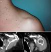 Mujer de 40 años. Consultó por aparición de una tumoración en la articulación acromioclavicular (AAC) tras haber realizado un esfuerzo de tracción vertical del brazo izquierdo (levantó desde el suelo una carga de 40 kg) 2 días antes. La lesión era indolora, redondeada y poco compresible. No presentaba signos inflamatorios. No había limitación funcional del hombro aunque notaba molestias al comprimir la lesión. (fig. 1 A).