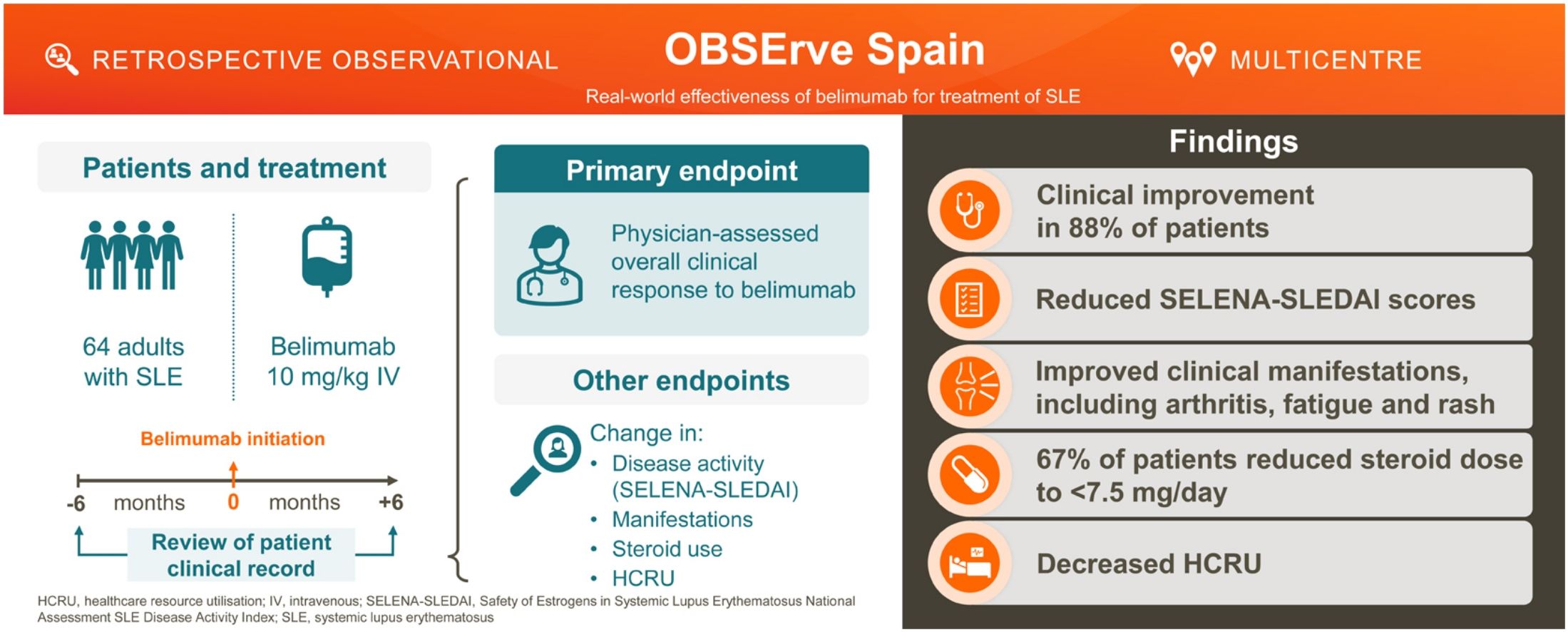 This OBSErve Spain study, a part of the international OBSErve programme, evaluated belimumab real-world use and effectiveness following 6 months of treatment in patients with active systemic lupus erythematosus (SLE) in clinical practice in Spain.